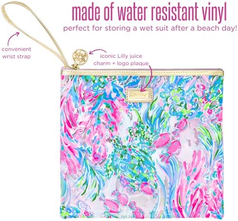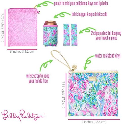 Lilly Pulitzer Water Resistant Vinyl Beach Day Pouch – Includes Drink Hugger, Zip Pouch, and Towel Clips, Best Fishes