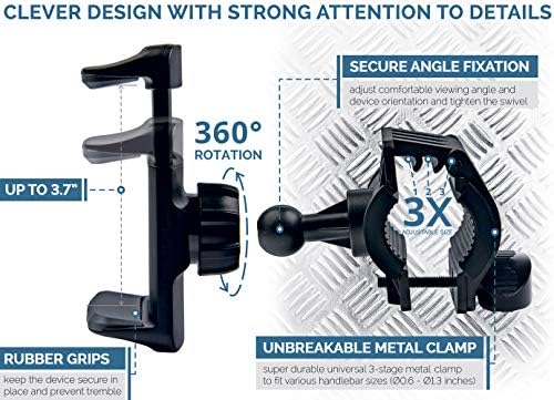 EXTRA SECURE & SHOCK ABSORBING rubberized clip with silicone belt grips device firmly and securely. The band wraps around four corners of cellphone of any size even when in lifeproof case. This thing holds tight, make the most extreme ride – the phone will not fall! The metallic bar clamp is unbreakable!
