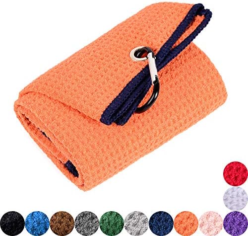 TOWEL:Tri-fold Microfiber with waffle design removes dirt, mud, sand and grass better than cotton towels. Size 16” x 21” with a heavy duty aluminum clip/carabiner that conveniently attaches to your golf bag.