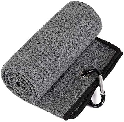 TOWEL:Tri-fold Microfiber with waffle design removes dirt, mud, sand and grass better than cotton towels. Size 16” x 21” with a heavy duty aluminum clip/carabiner that conveniently attaches to your golf bag.
