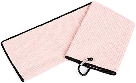 TOWEL:Tri-fold Microfiber with waffle design removes dirt, mud, sand and grass better than cotton towels. Size 16” x 21” with a heavy duty aluminum clip/carabiner that conveniently attaches to your golf bag and prevents loose clip and lost towels.