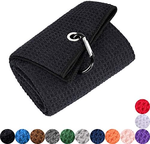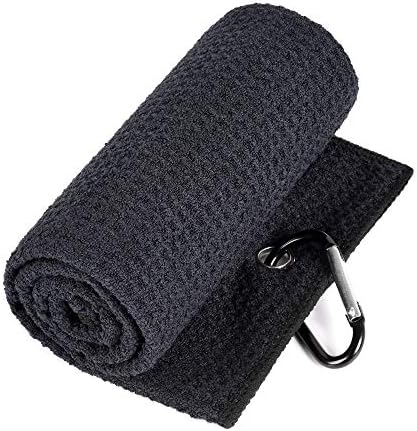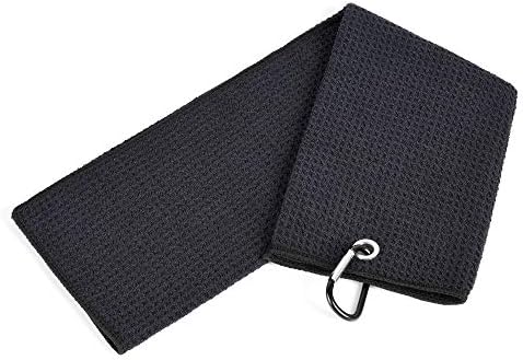 TOWEL:Tri-fold Microfiber with waffle design removes dirt, mud, sand and grass better than cotton towels. Size 16” x 21” with a heavy duty aluminum clip/carabiner that conveniently attaches to your golf bag and prevents loose clip and lost towels.