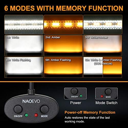 ——The Memory Function is NAOEVO Exclusive Feature. NAOEVO 6 modes light bar can be used for off-road, Jungle adventure. Amber lights has strong penetration, works great as a warning light, strobe lights or led fog lights for trucks. White light is used for led driving lights or work lights.