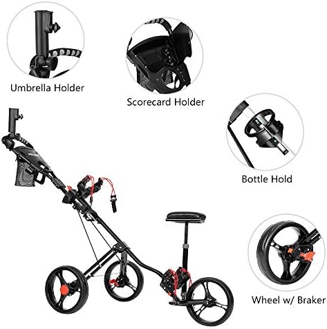 PEXMOR Golf Push Cart, 3 Wheel Folding Golf Trolley w/Seat, Foot Brake, Umbrella Holder, Cup Holder, Scoreboard Bag, Easy Push and Pull Golf Cart
