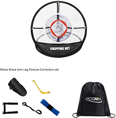 POSMA CN010E Portable Golf Chipping Hitting Swing Trainer Bundle Kit Gift Set with 1pc Hitting Net + 5pcs Elbow Brace Arm Leg Posture Correctors Set+ 1pc Black Cinch Sack Carry Bag- Golf Training aid