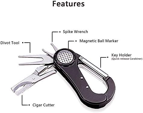 4. The 5-in-1Divot Repair Tools consist of Divot Tool, Spike Wrench, Cigar Cutter, Ball Marker, and Key Holder(Quick-release Carabiner)