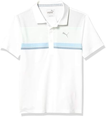 PUMA Golf Kids Size Chart Tap into competition mode and keep your head in the game with the airy PUMA® Golf Kids Road Map Polo. Standard fit top is shaped close to the body without restricting mobility. Ultra-lightweight weave crafted with a tad of stretch to allow full range of motion. Spread collar. Half-button placket. Short-sleeve coverage. Solid upper with variegated striped detail along bottom half. Embroidered brand marking hits upper left. Straight hem. 92% polyester, 8% elastane. Machine wash, tumble dry. Imported. Measurements: Length: 24 1⁄2 in Product measurements were taken using size LG (14-16 Big Kids). Please note that measurements may vary by size.