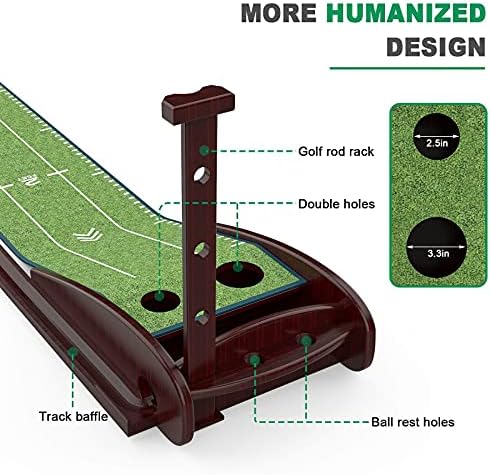 ❤More Humanized Design: The practice putting mat adopts the design of large and small double holes. The holes with diameters of 2.5in and 3.3in allow you to carry out putting practice of different difficulties. The solid wood golf rod rack is convenient for you to lean the club on it when not in use, and the ball rest holes allow you to place free golf balls.