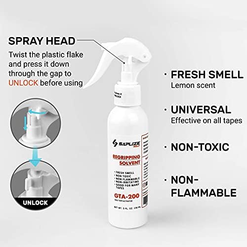 ?【UNIVERSAL GRIP SOLVENT】5oz bottle of SAPLIZE grip solvent with spray head included. Non-toxic, non-flammable liquid solution and works on all tapes.