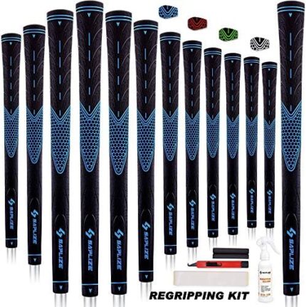 Multi colored durable putter grip has soft polyurethane surface, jumbo pistol shape, & a removable gel top ball marker