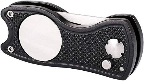 FOLDABLE DIVOT TOOL: Dimension 2 3/4 inch x 1 1/4 inch x 1/2 inch, avoid scratch in the pocket, Pop down button for easy unfolding. Full Metal with magnetic ball marker that attaches to the divot tool, easy push down to pop and reseat. Solid grip and feel.