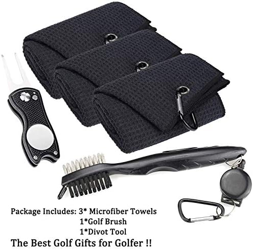 AMAZING 5 PACK GOLF GIFTS ACCESSORIES: 3*jumbo size professional, microfiber waffle weave golf towels + 1*Foldable Divot Tool + 1*Club Brush.