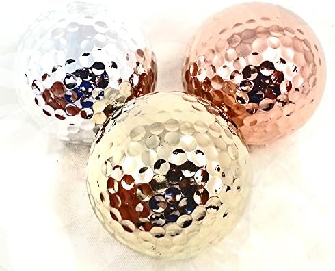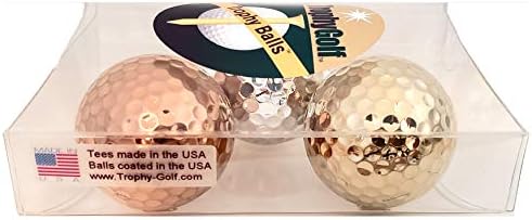 TROPHY BALLs are brilliant metallic real golf balls with a thin metallic coating over the entire balls surface. This unique and proprietary coating is applied in the United States over genuine Nike balls. The silver, gold, and copper/bronze coatings make the dimpled balls look like a disco ball that completely stands out in a crowd of white and colored balls. Sets of 3 TROPHY BALLs are packed in clear durable tubes with low-profile black caps for a stunning gift presentation. The balls are completely playable as regulation balls. The coating is tightly bonded to the ball and won’t scratch off with a fingernail, but it will break down with the impact of a metal golf club. Putting strokes generally do not affect the surface finish of the ball.