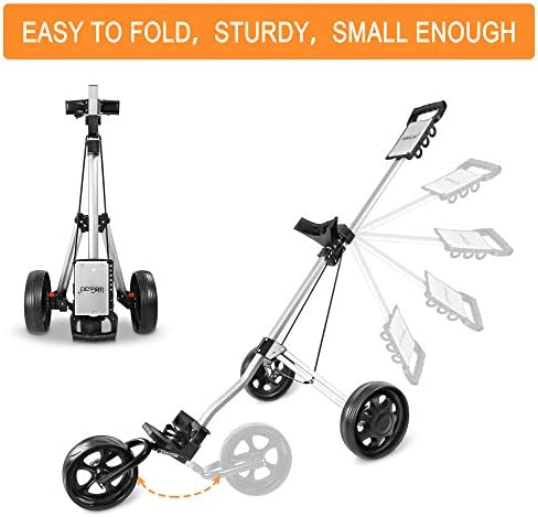 【FOOT-BRAKE SYSTEM】Foot-brake system can avoid any preventable accidents, such as sliding away or falling down. For maximum mobility, this folding golf cart also features ball bearing wheels for a smooth ride over any terrain.