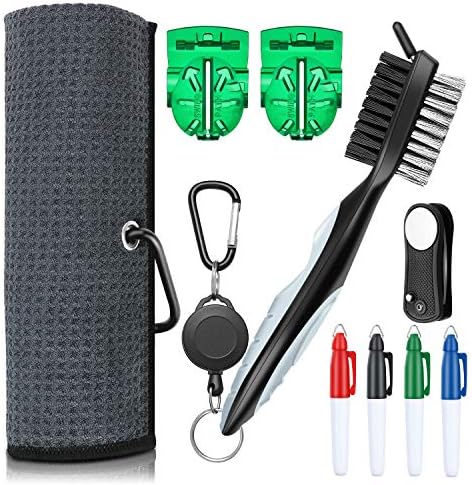 XAegis GT13 Golf Towel and Brush to Clean Golf Club with Magnet Divot Tool,Golf Ball Liners,Pens – 9 in 1 Golf Accessories