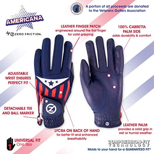 Zero Friction Americana Cabretta Golf GloveFeatures: * Show off your patriotic spiritA on the golf course * 100% Cabretta leather palms for comfort and durability * Lycra on back of hand and fingers maintains breathability and flexibility * Leather finger patch around first finger allows for a solid grip * Detachable ZF 1-3/4″ Hybrid tee and ball marker for convenience * Compression Fit Technology molds to your hand for universal fit * Golf gloves are worn on the opposite of your dominant hand * Sizing: One Size Fits Most