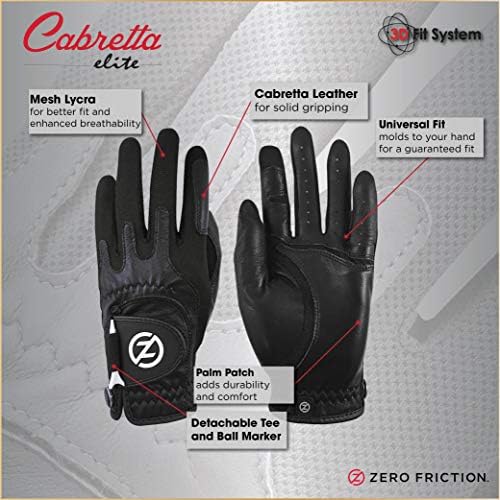 Zero Friction unique compression-fit technology, 100% authentic cabarets leather glove gets a make-over with matching lira colors. The elite glove is crafted with reinforced lira throughout finger, back of hand & palm for maximum strength, durability and enhanced breathability. The luxurious cabarets leather gives every golfer the ultimate glove experience allowing for maximum grip in almost all elements. Every glove includes a detachable tee and ball Marker.